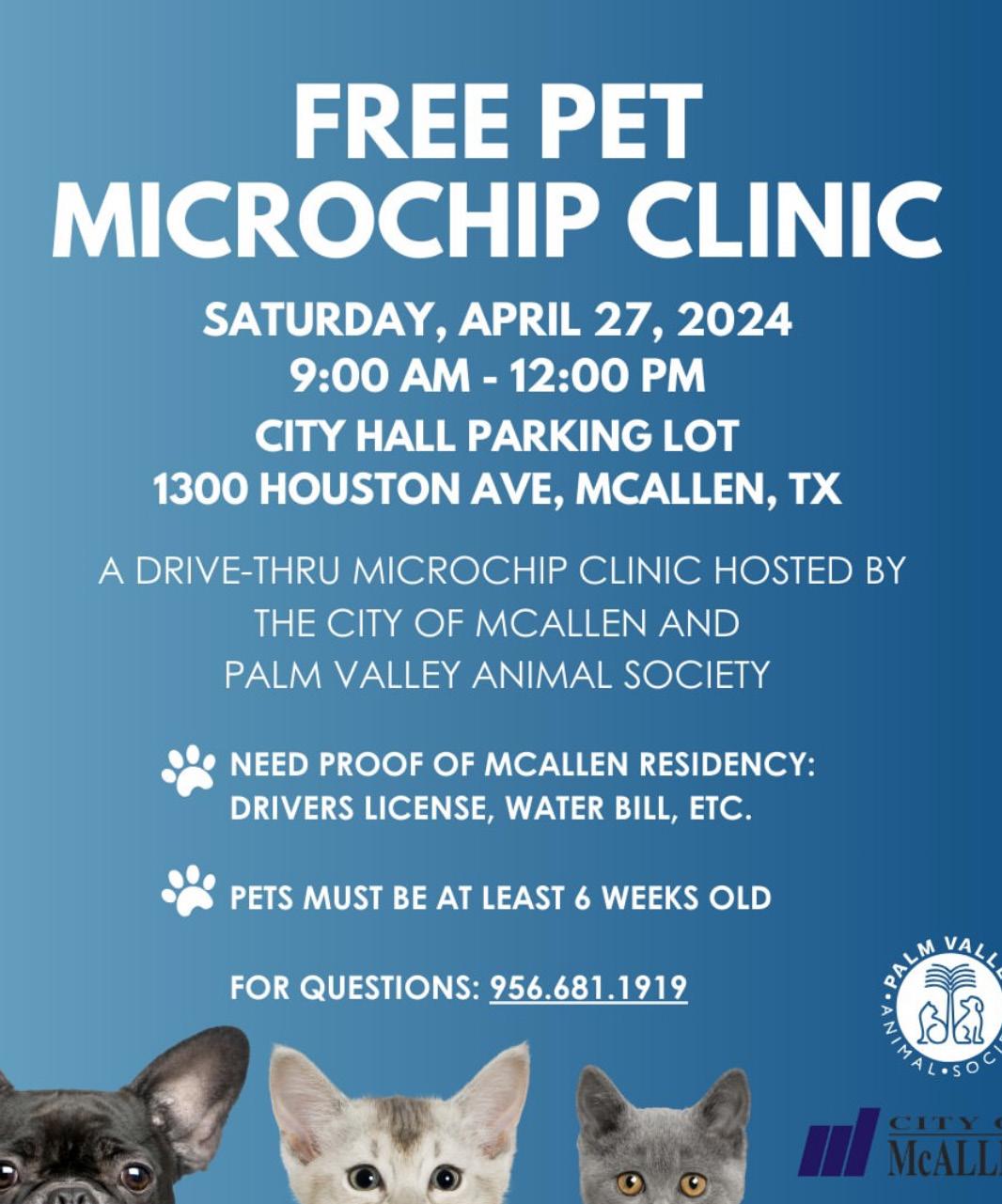 Don't miss out! Join us for a FREE microchip clinic with the City of McAllen at City Hall Parking Lot on Saturday, April 27th, from 9 AM to 12 PM. Let's be responsible pet owners and ensure our pet's safety by getting them microchipped!