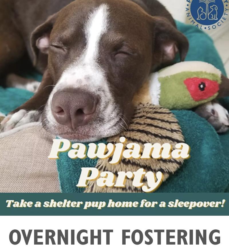 The Pawjama Party Program, offering a chance to foster a shelter dog for up to 4 nights—for free! It's a win-win opportunity to give them a break from kennel life and possibly find your new furry friend.