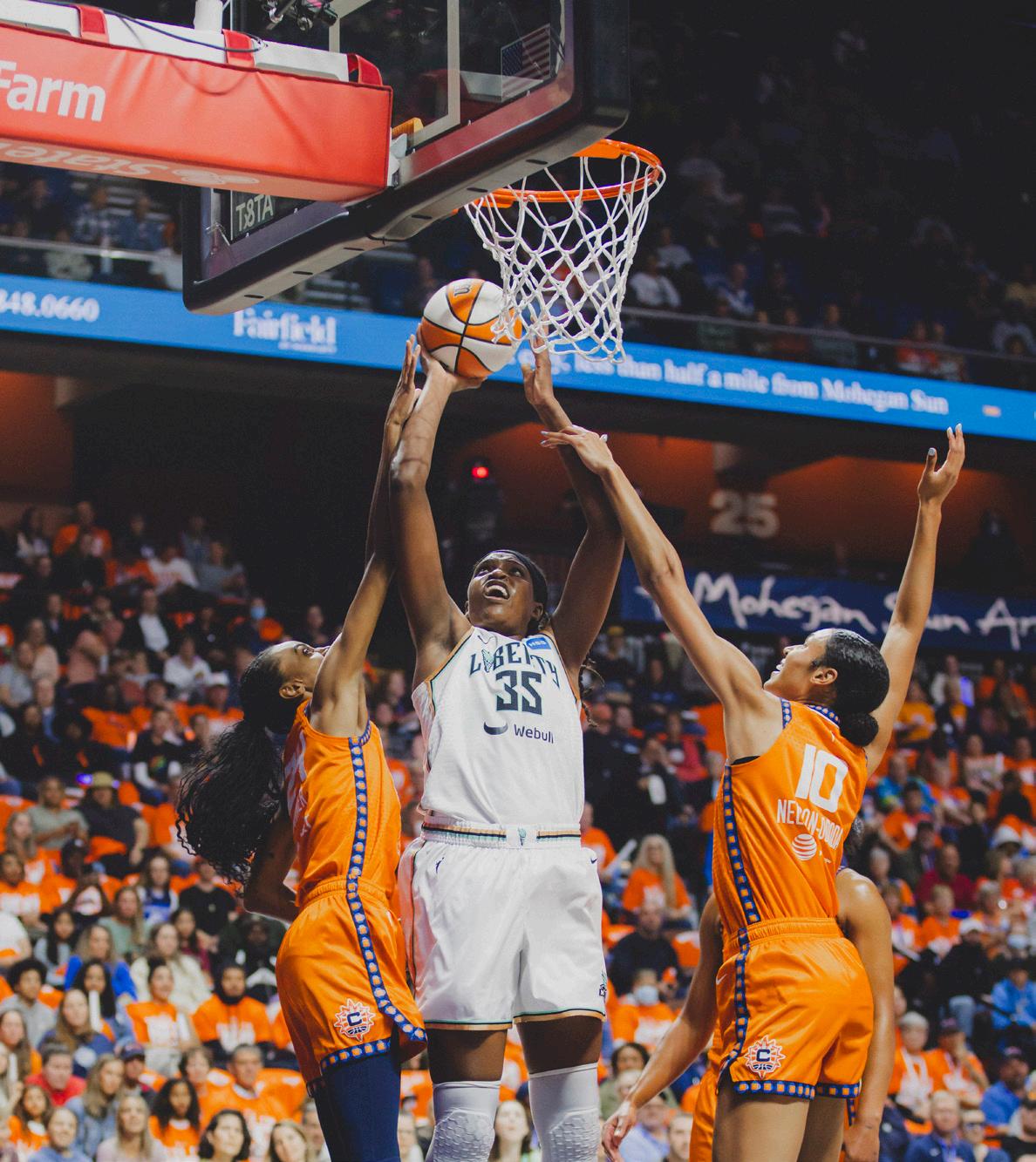 The Liberty’s Jonquel Jones was unrelenting in her team’s 87-84 win over the Connecticut Sun in Game 4 of their WNBA semifinals series (Brandon Todd/New York Liberty photo)
