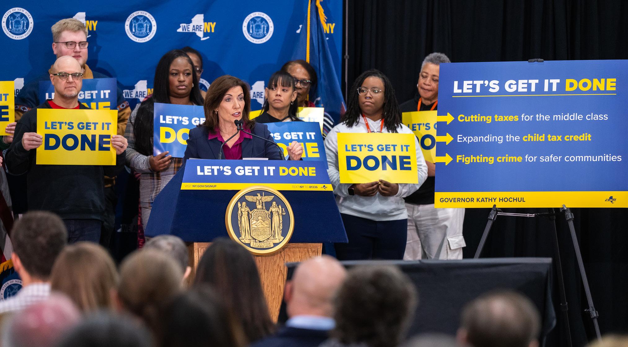 Among a laundry list of items in the Fiscal Year 2026 budget, Hochul is pushing for middle-class tax cuts, expanding the Child Tax Credit over two years, providing inflation refund checks of up to $500, free school breakfast and lunch for students, full repeal of the State and Local Tax deduction, $370 million for public safety and law enforcement initiatives, and $77 million for cops in New York City subways.