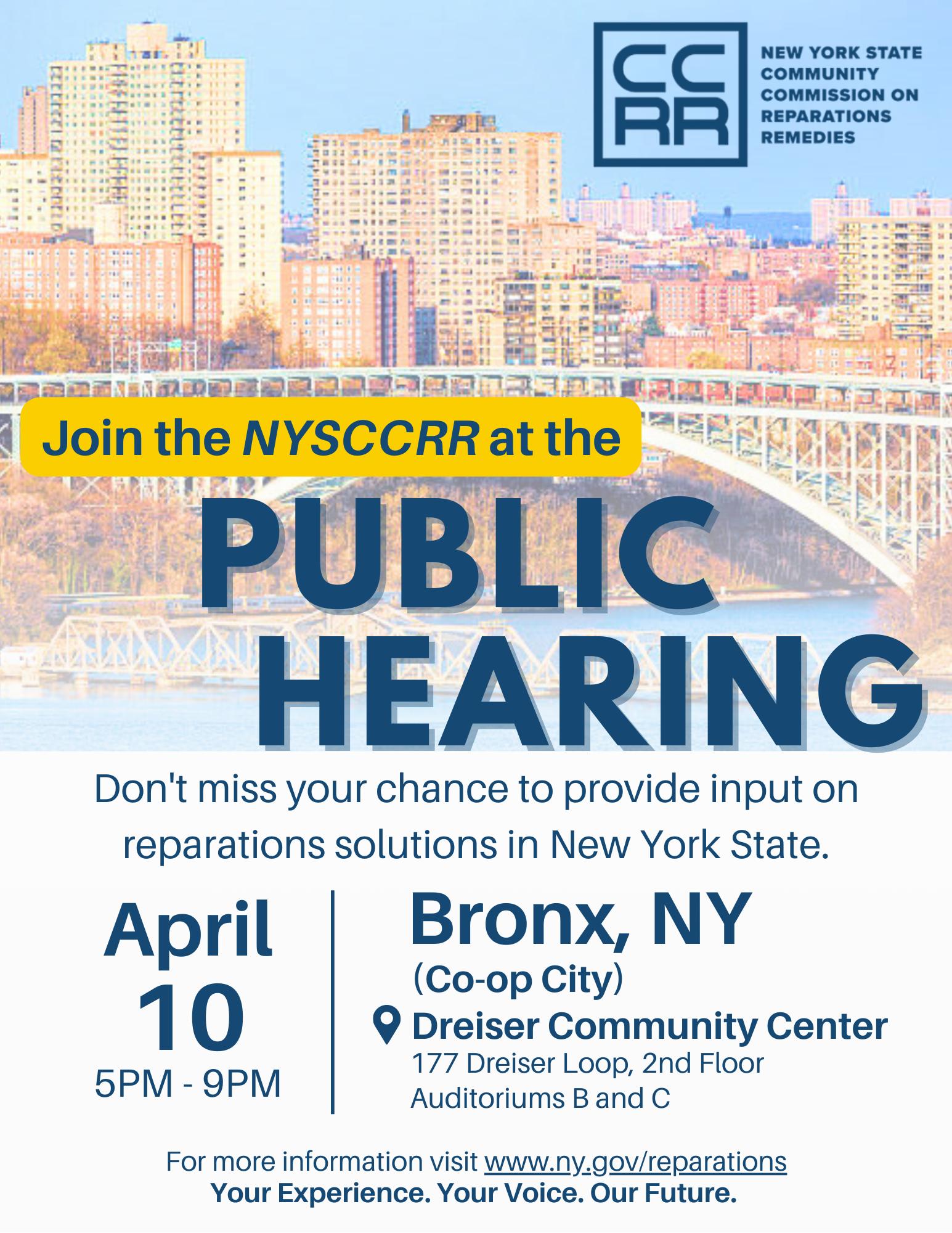 After meetings held in Buffalo, Albany, Rochester, and Southeast Queens, the Bronx is set to host the next New York State Community Commission on Reparations Remedies (CCRR) hearing.