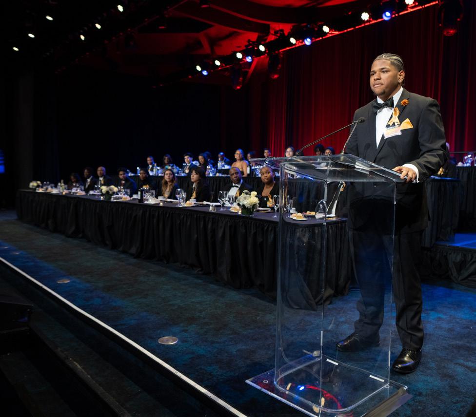 Maurice Anderson, 17-year-old student at Thurgood Marshall Academy was awarded the Carrie Terrell Award during the Harlem YMCA bai Achievers in Industry gala in the Marriott Marquis. March, 13, 2025. (Harlem YMCA)