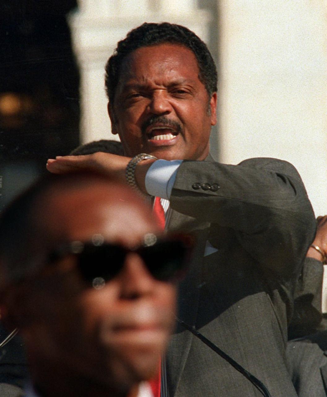 Rev. Jesse Jackson, standing behind bullet-proof glass, gestures while addressing Million Man March. (Doug Mills/ AP photos)