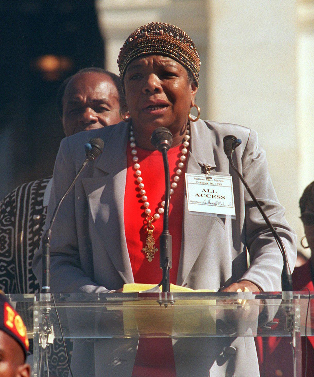 Poet Maya Angelou addresses Million Man March, Monday, Oct. 16, 1995, on Capitol Hill. Washington Mayor Marion Barry is at left.