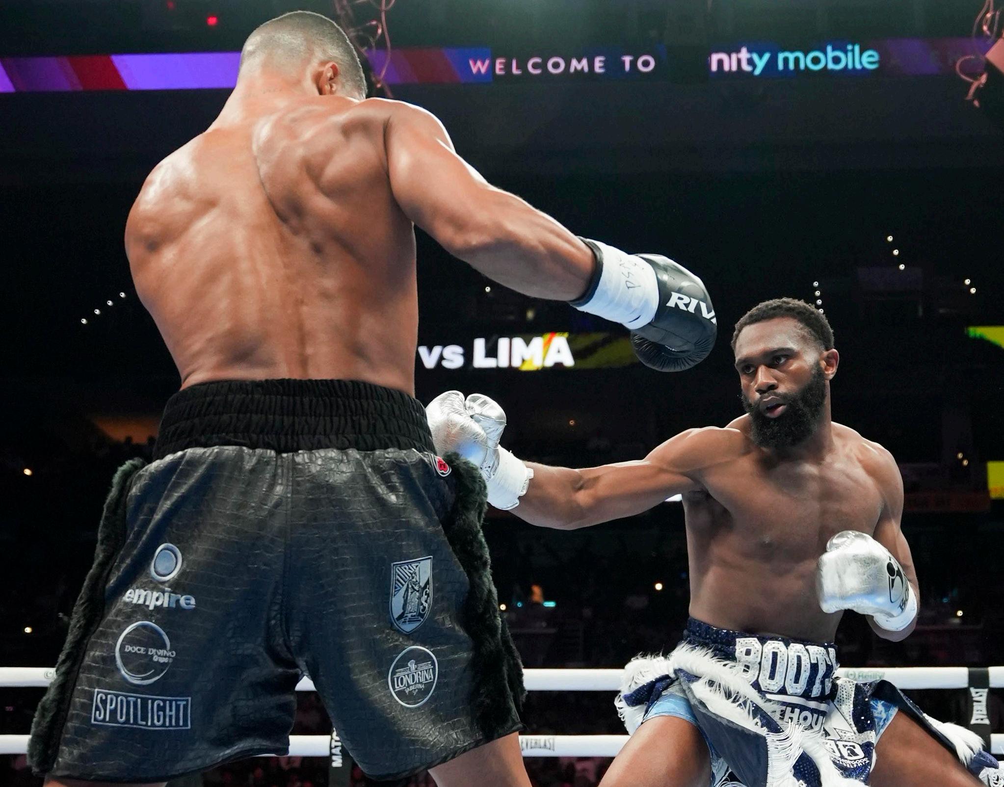 Philadelphia native Jaron Ennis (right), fighting in his hometown on Saturday TKOd Uisma Lima in the first round at Xfinity Mobile Arena to capture the WBA interim super welterweight title. (Emma Brawley/Matchroom Boxing photo)