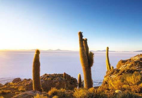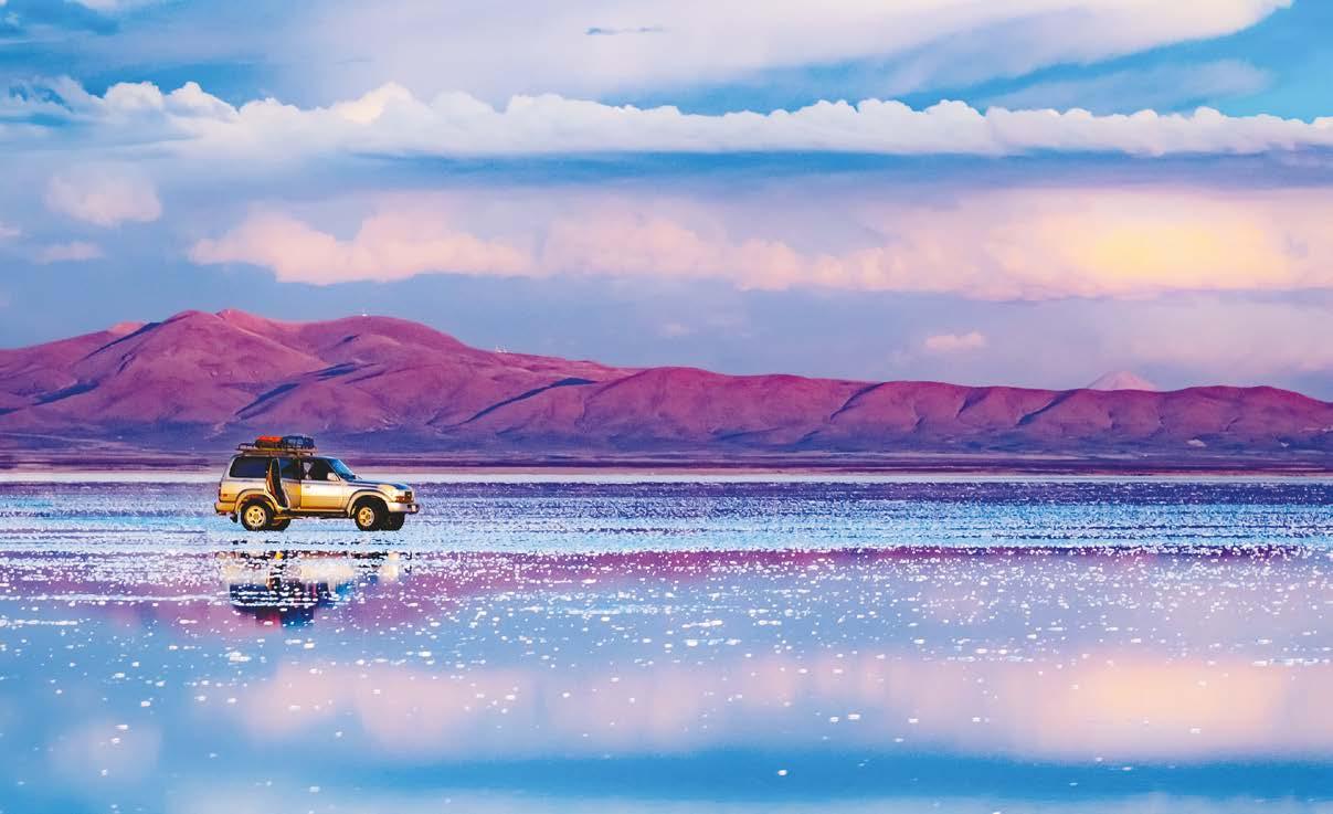 El Salar de Uyuni es el salar más grande del mundo, con una superficie de casi 11 000 km2. Está situado en el suroeste de Bolivia, a una altitud de 3663 m sobre el nivel del mar y es el resultado de la evaporación* de un lago prehistórico que dejó una capa de sal y minerales.