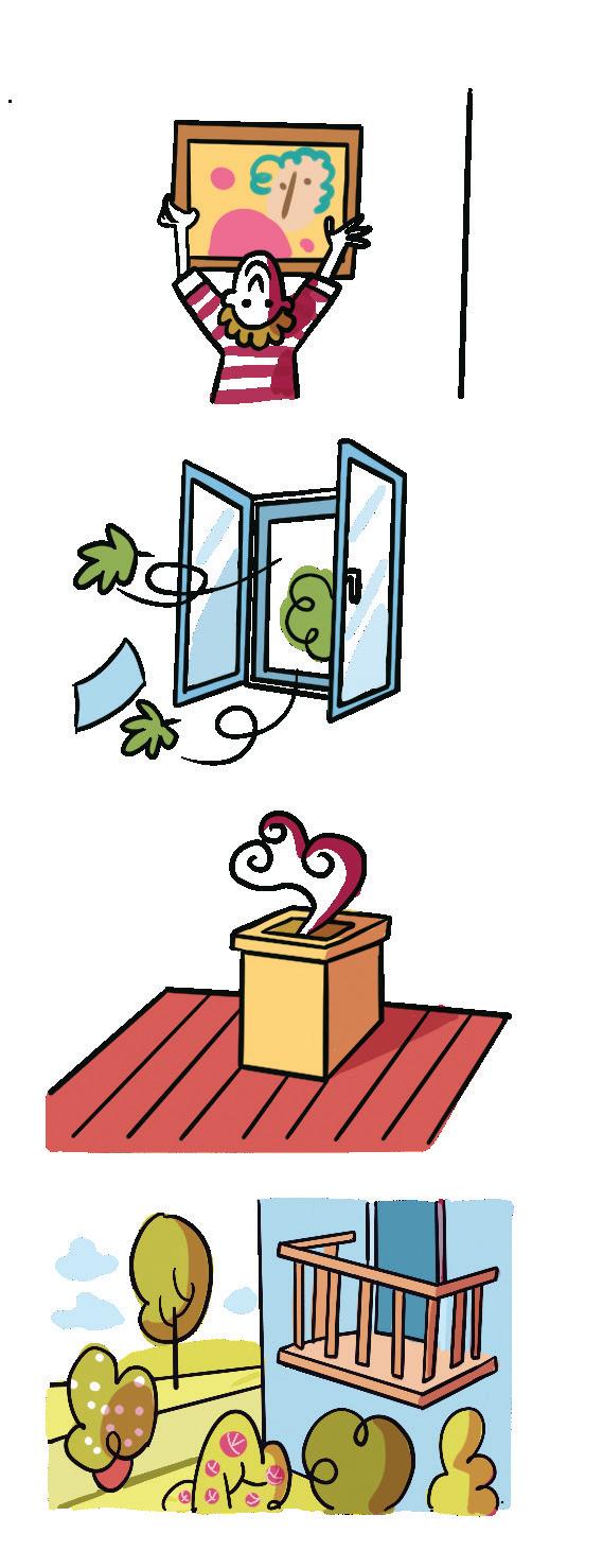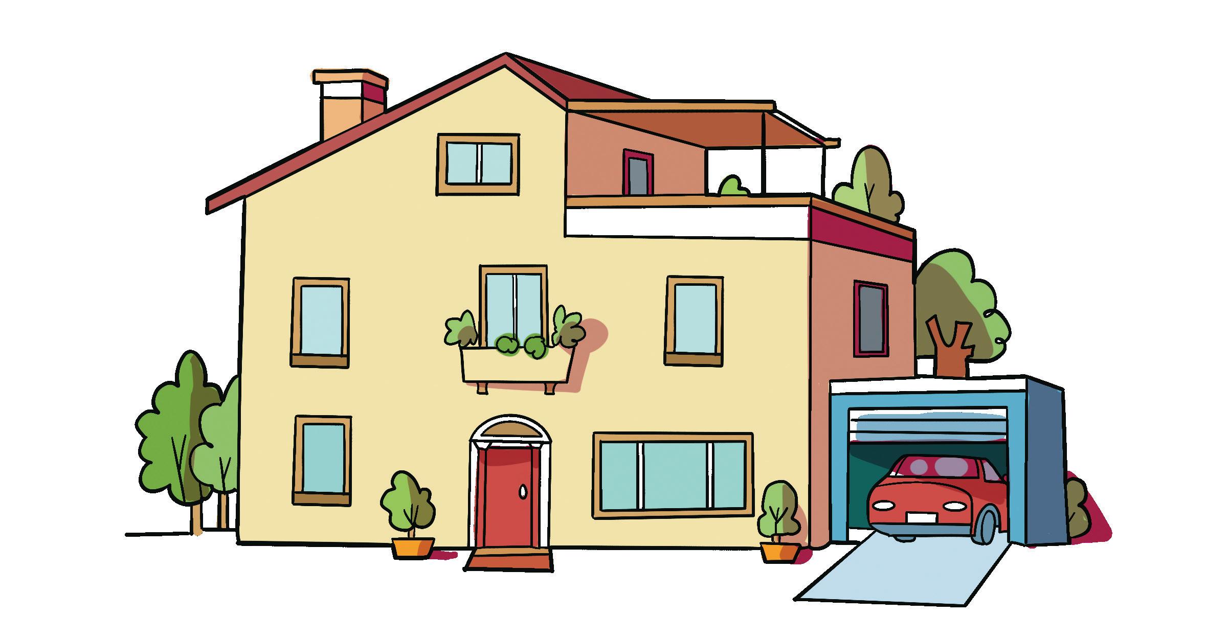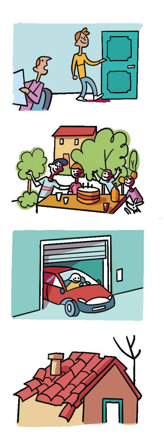6 Guarda i disegni e completa le frasi. Guarda il disegno e scrivi le parole. I Rossi festeggiano il compleanno del figlio in . La della camera è aperta. Il vento ha danneggiato il Il __________ dà sul giardino. Il signor Ducati tira fuori la sua auto dal . Il fumo esce dal Vai tu ad aprire la ?