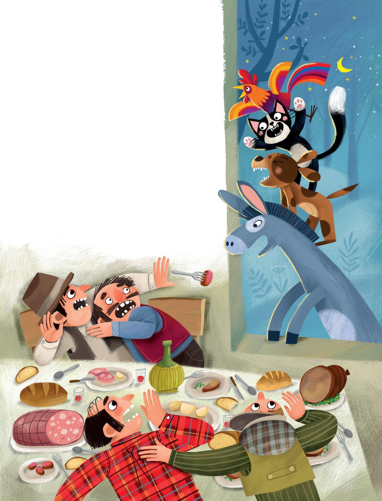 – Jump on my back� – says the donkey� The dog jumps on the donkey� The cat jumps on the dog� The rooster jumps on the cat� Then they start to shout�