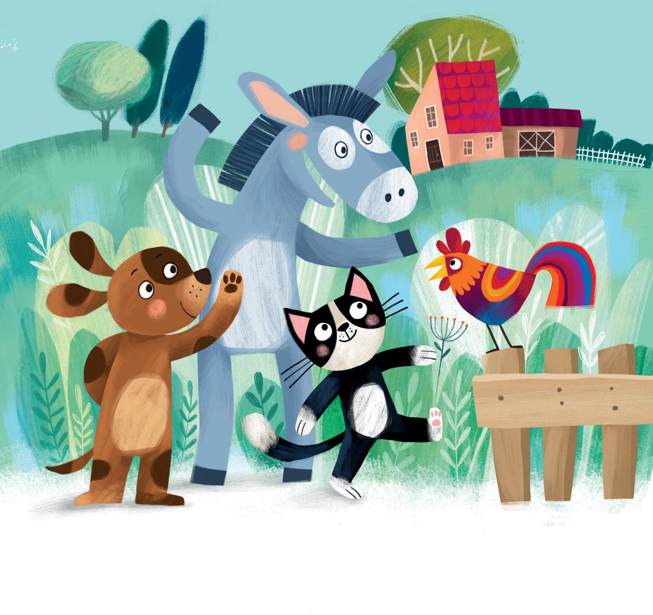The donkey, the dog and the cat walk and walk� They meet a rooster�