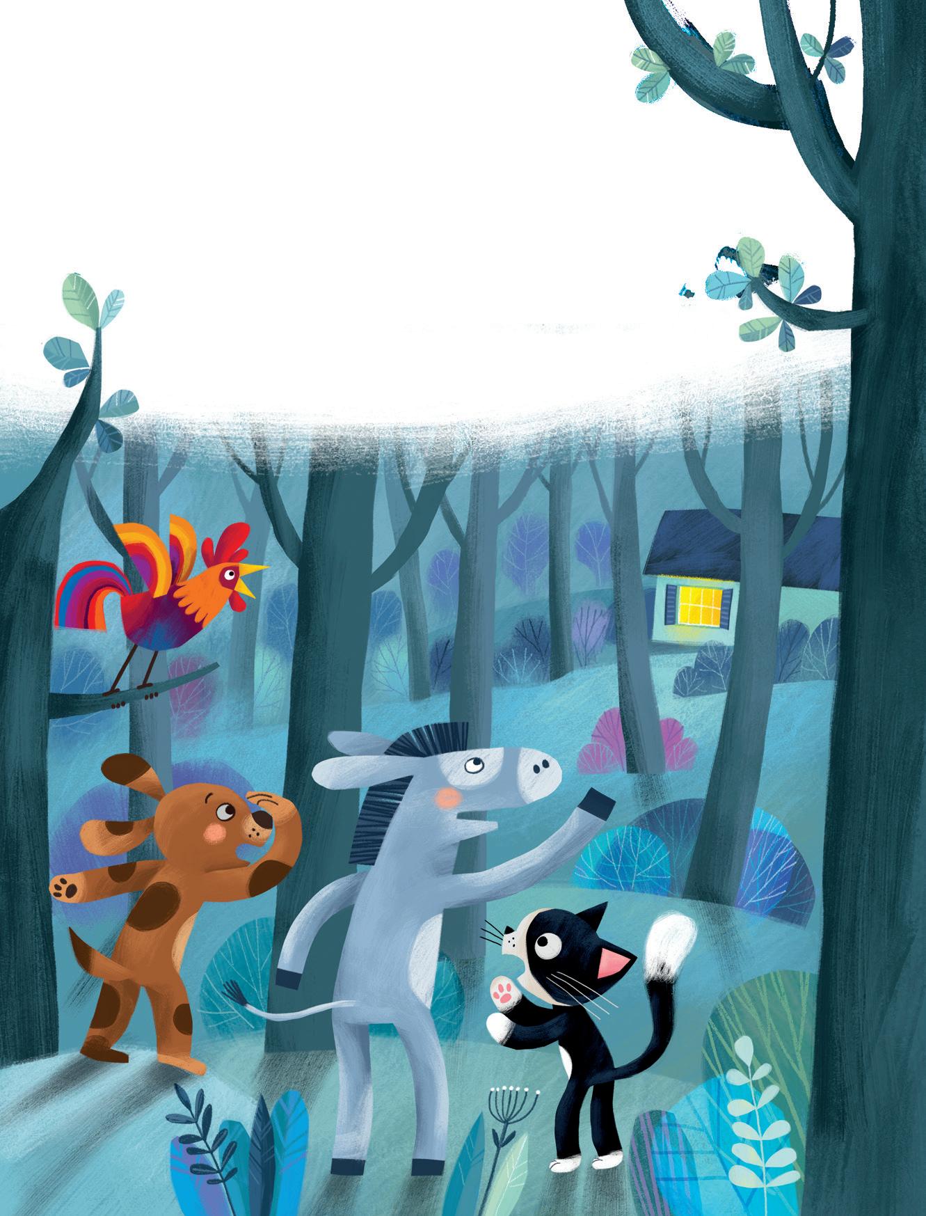 The donkey, the dog, the cat and the rooster walk and walk� They enter a wood� It’s very dark in the wood�