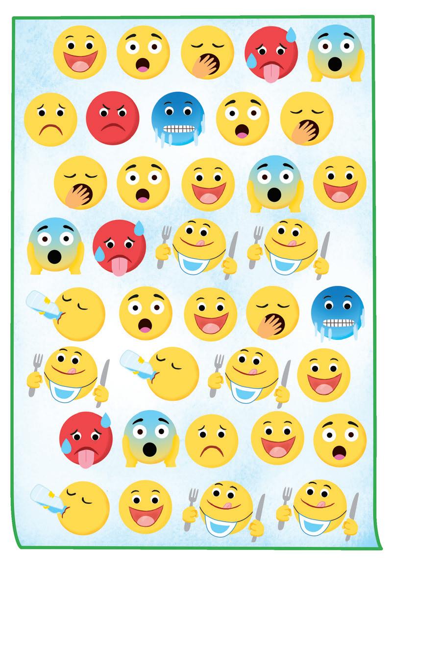 Osserva il disegno, conta le faccine e segna se il numero è giusto (✔) o sbagliato (✘). A. hot 3 B. thirsty 4 C. cold 2 D. angry 1 E. surprised 4