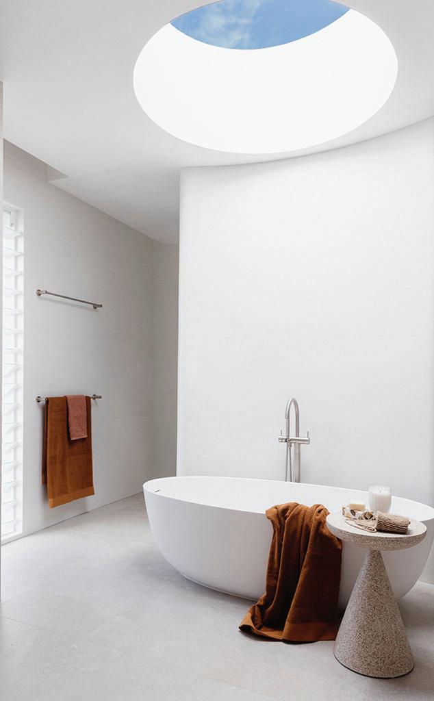 The extensive use of fluid curves is a standout feature of the H2 Home project, showcasing the versatility of Corian. From the curved walls to the tight radius on shower nib walls, the precision and flexibility of the material are evident. The master ensuite boasts a freestanding Corian bath framed by a curved full-height Corian wall, complemented by a circular skylight directly above. A fully Corian clad double shower space accessible from behind the bath wall adds a touch of relaxed luxury.
