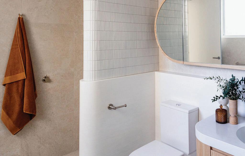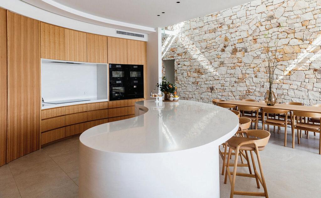 Corian was the material of choice for this project due to its ability to fulfill the design criteria and meet the client’s preference for low-maintenance finishes. The design team skilfully incorporated fluid curves as a signature feature throughout the home, including the kitchen appliance walls, island bench, shower and bath enclosures, vanity tops, and shower nib walls. This