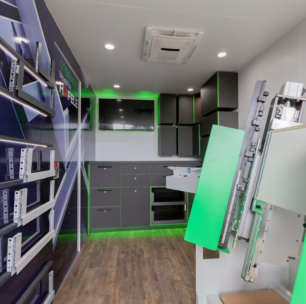 The mobile showroom is packed full of Grass products, including the TECMATOR drawer assembly machine that can assemble a drawer in under 25 seconds.