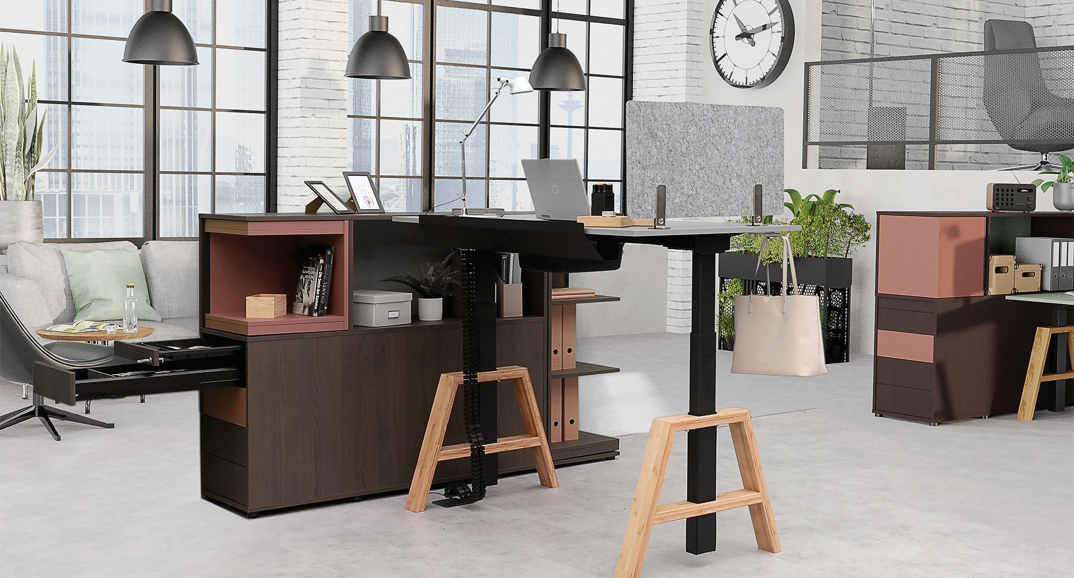 homeworking furniture must permit an ergonomically sound and healthy working style while at the same time integrating into the home environment. After work, furniture should transform into living space furniture making it possible to switch off and relax. Hettich's modern bureau interpretation can do this. It hides away an entire homeworking facility, including a height adjustable desk. This can be rolled out into any space and set to a height for working with ergonomic benefit.