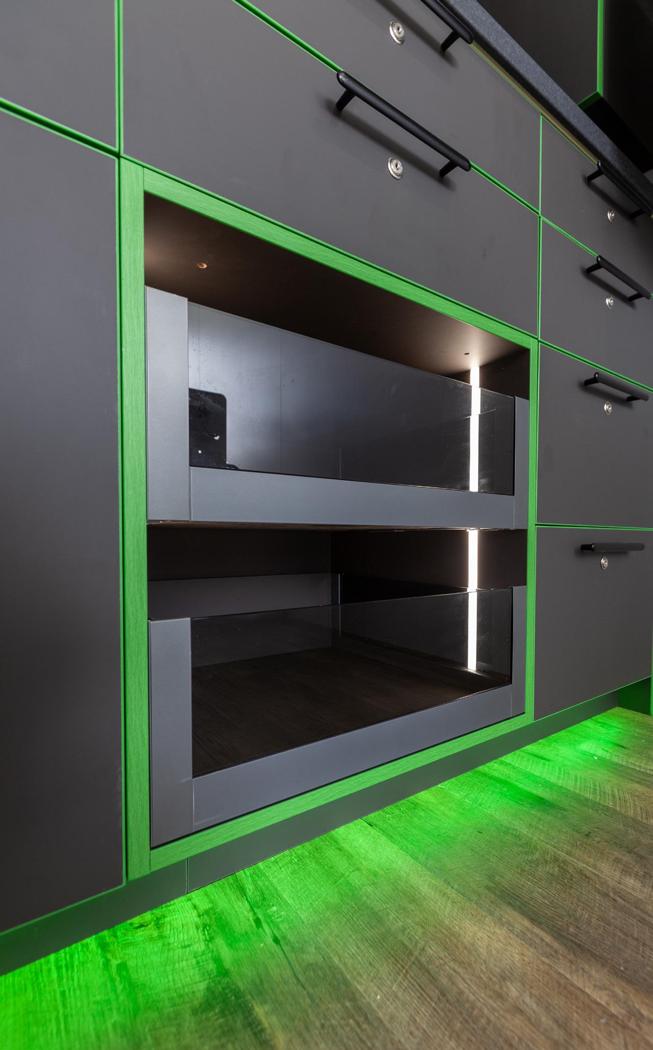 Clad in laser-welded, powder-coated steel, the characteristic frame has become a distinctive trademark: With a wide range of design options, the complete drawer unit becomes a one-of-a-kind experience. Thanks to the rectangular shape, the strikingly simple metal design can be combined with custom designer panels as desired, for example with high-quality mineral resin surfaces or elegant real-wood designs. This creates an unparalleled range of options for giving furniture an individual, unique profile.