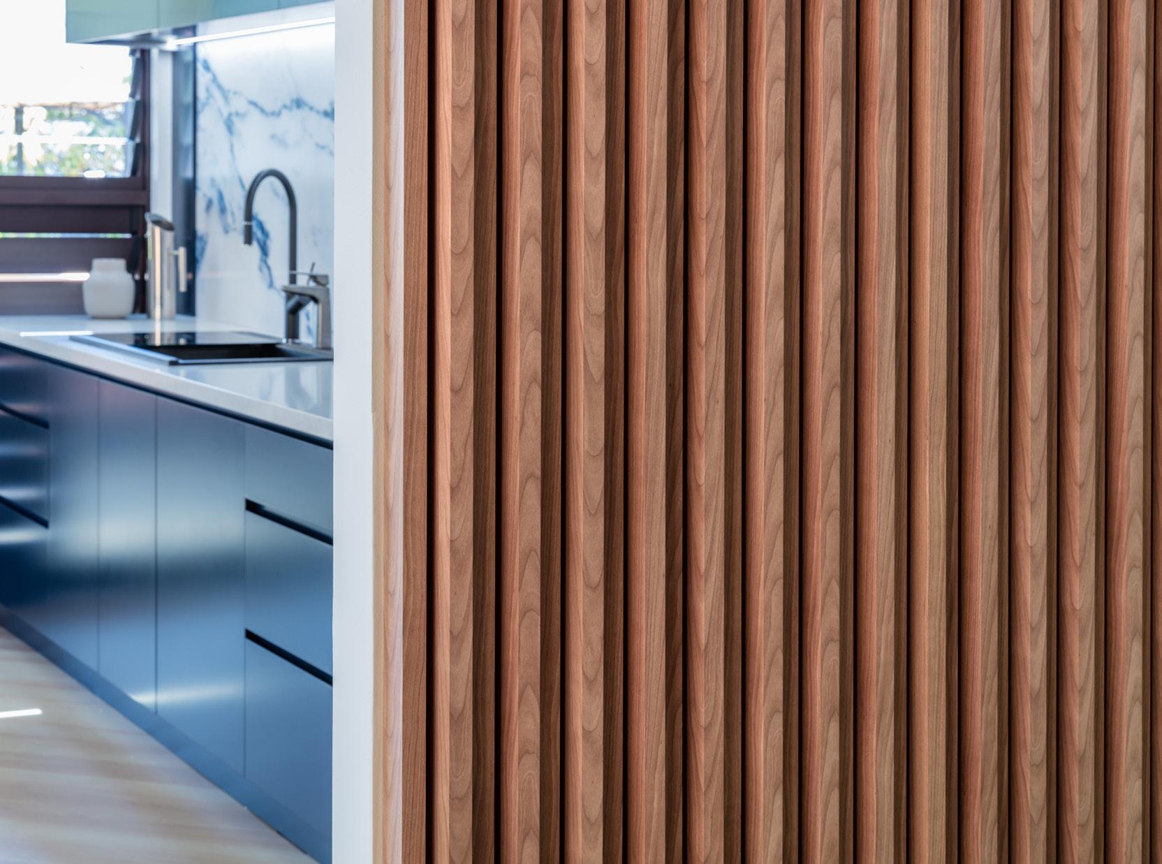 The seamless flow of Corian surfaces creates a sense of unity throughout the lower levels, with the benchtop extending continuously from the scullery through the kitchen, living spaces, and to the poolside kitchen and terrace, covering an impressive total length of 21 meters.
