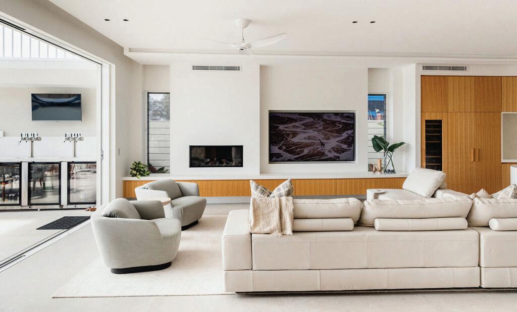 The H2 Home project showcases Rust Architecture Design’s commitment to creating spaces that blend natural elements, neutral colour palettes, and minimalist aesthetics. The residence spans two levels, with the ground floor featuring an open concept living, dining, and kitchen area that seamlessly connects to the outdoor entertaining spaces. On the first floor, the master bedroom suite and two of the four guest bedrooms, all with ensuites, provide a private retreat for the homeowners and their guests.