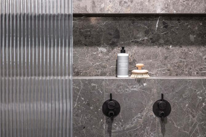 “We incorporated elegant pieces such as a freestanding marble Oman Bath surrounded by StoneArc feature tiles from Skheme, stylish lighting, and high-end hardware that elevated the overall look and feel of the bathroom,” said Ben.