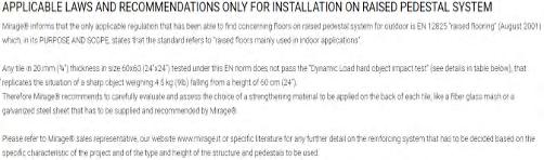 Although the limiting information from this manufacturer is problematic, there are other manufacturers that seemingly understand the issues related to impact resistance of 20mm porcelain on pedestals or raised floors. They aim to assist the general public or consumer with providing guidance. See photo 3 below.