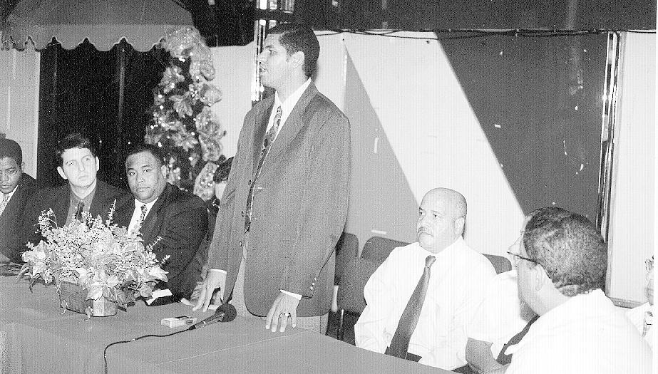 La Asociación Odontológica Dominicana, provincial Duarte, celebró su cena fiesta de navidad, y al mismo tiempo juramentó su nueva directiva para el período diciembre 2001 2003, en un acto realizado la noche del sábado 15 en el club deportivo y cultural Olímpia, con la animación del g r u p o H i e r r o y L o s Profesionales