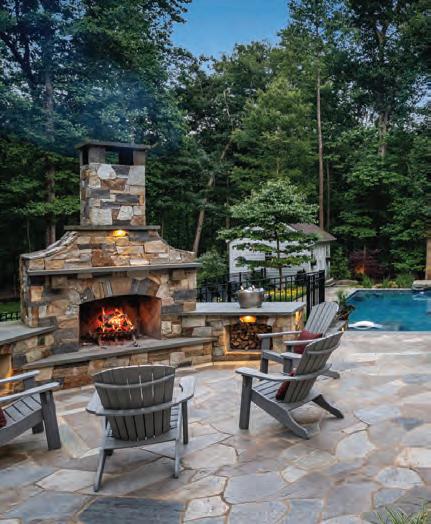 Much like an interior living room, consider anchoring the outdoor space with a beautiful focal point, such as a firepit or stone fireplace, which adds ambiance as well as an inviting and organic texture to the environment. The coordinated use of materials such as stone cladding, brick veneer, and stacked stone will help marry the interior and exterior areas seamlessly.