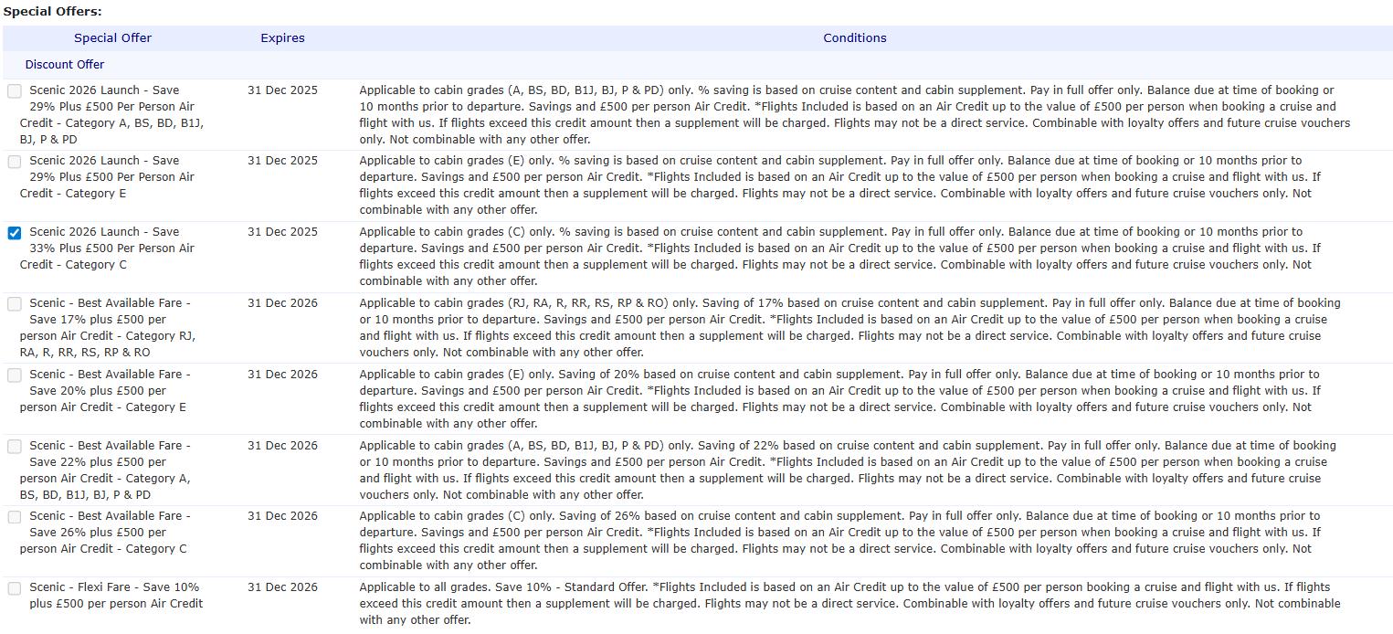 You’ll typically see three fare options for your selected cabin (e.g., Category C):