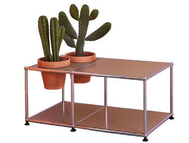 The iconic Cactus by Gufram in the new limited edition for its 50th anniversary, made in collaboration with the Andy Warhol Foundation of Visual Arts. Available in three colors – blue, pink and yellow – with 99 pieces each, in a 3D reinterpretation of the Pop Art master’s famous silkscreen prints (©/®/™ The Andy Warhol Foundation for the Visual Arts, Inc). A composition of the USM Haller modular system, in a new version offering a special watering set, permitting insertion of greenery thanks to special panels shaped to contain flowerpots (available in a single size, with two colors: Terracotta and Basalto). The panels come in 5 sizes and 14 colors. Ficus, a décor element by Chiaramonte-Marin for Emu. The base module in steel and expanded sheet metal can be combined with an extension and various complements: the leaf available in two colors, fruits and a ground leaf functioning as a lamp; covered in Emu-Coat (electrophoresis + paint). In the background: Magico Mexico fabric by Rubelli, created by the Mexican illustrator Gabriel Pacheco, printed on pure cotton.