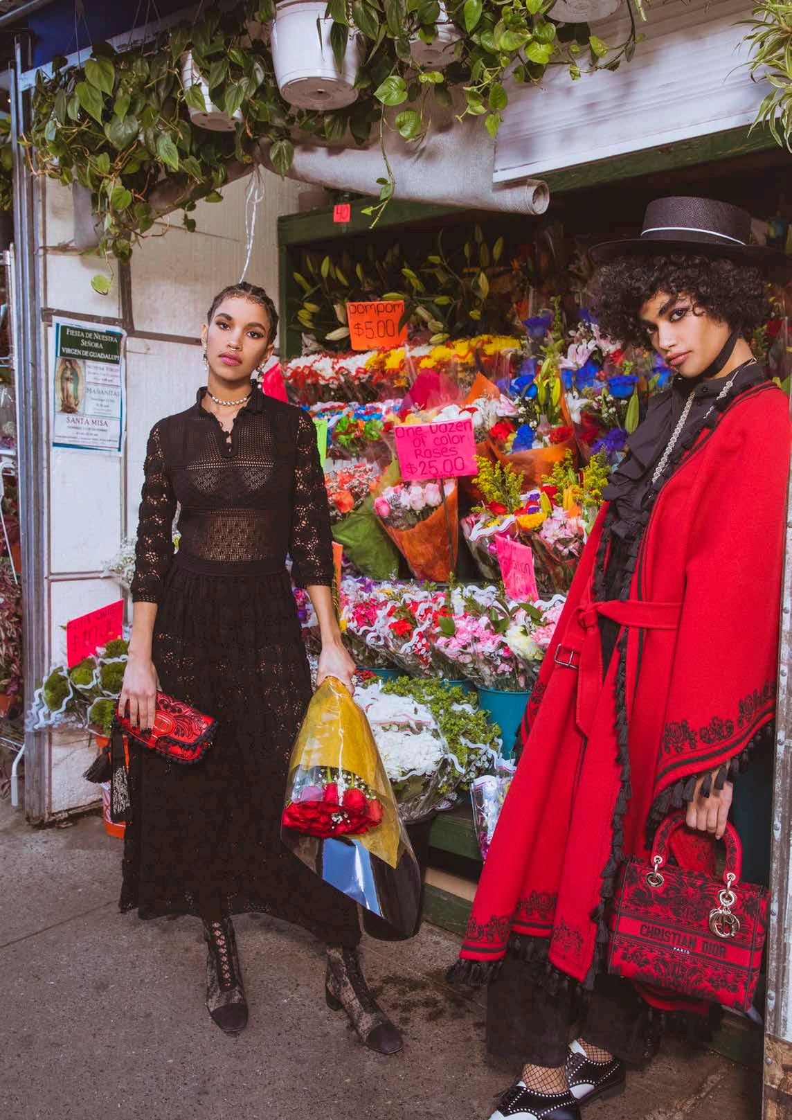 On Right: DIOR jacket, dress, choker, hat, fan, (800) 929-DIOR.