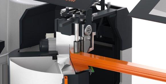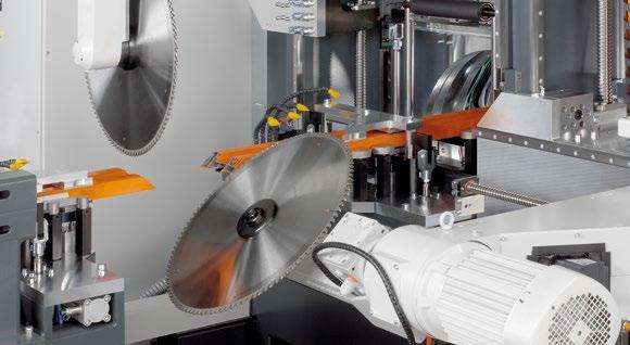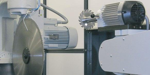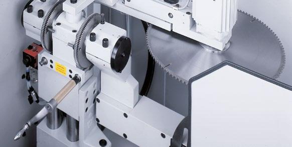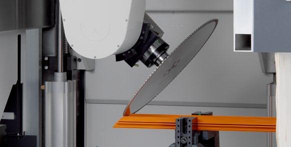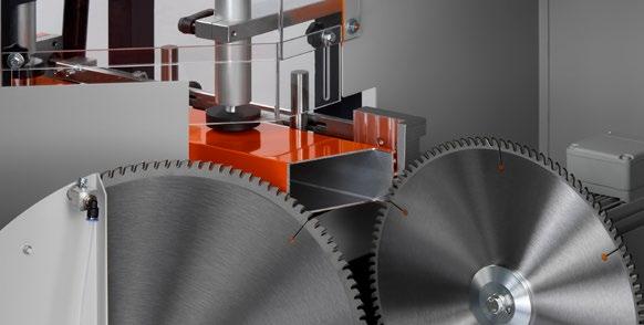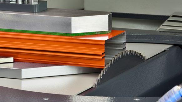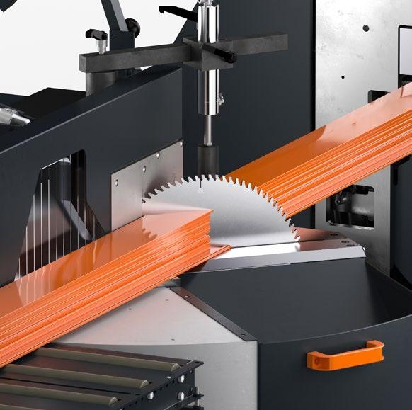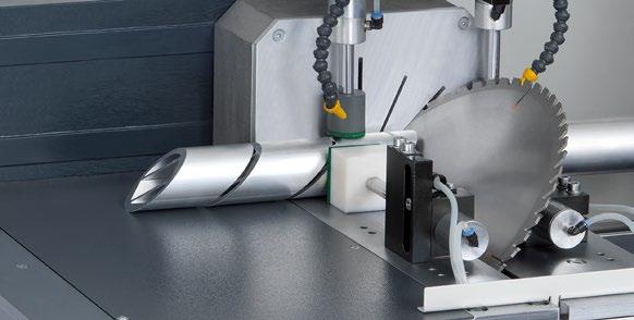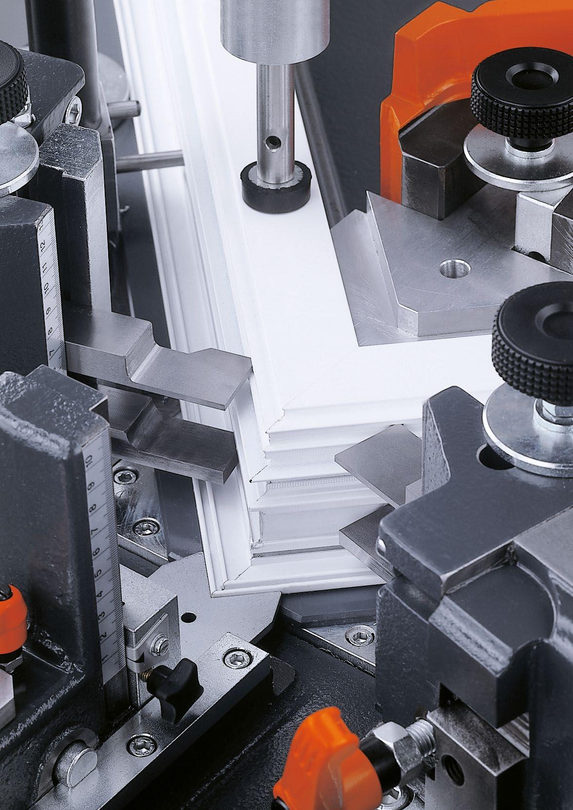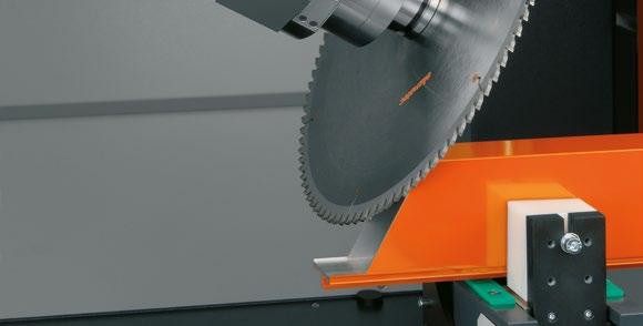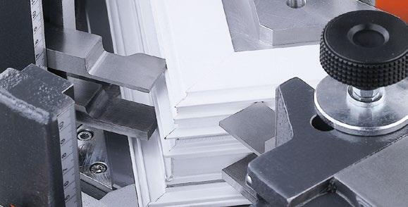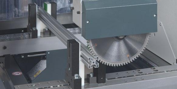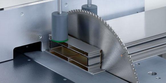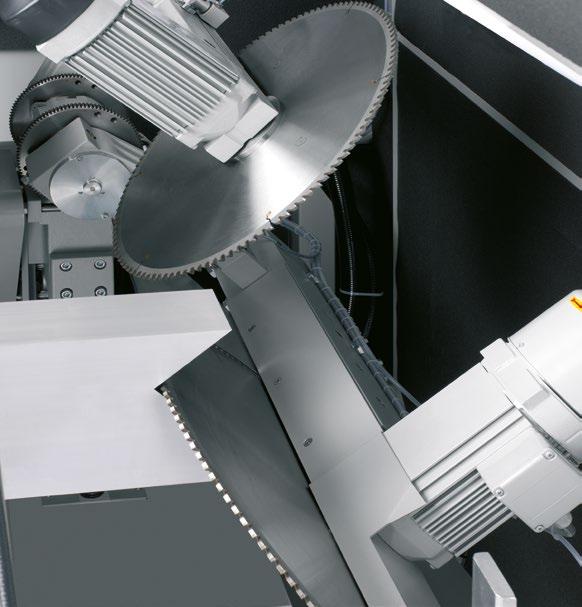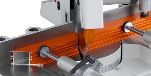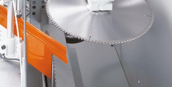 • La posibilidad de girar e inclinar de forma general los grupos de sierra permite cortar perfiles altos y anchos así como hacer todo tipo de cortes de inglete doble. Así pueden cortarse muchos perfiles sin suplementos