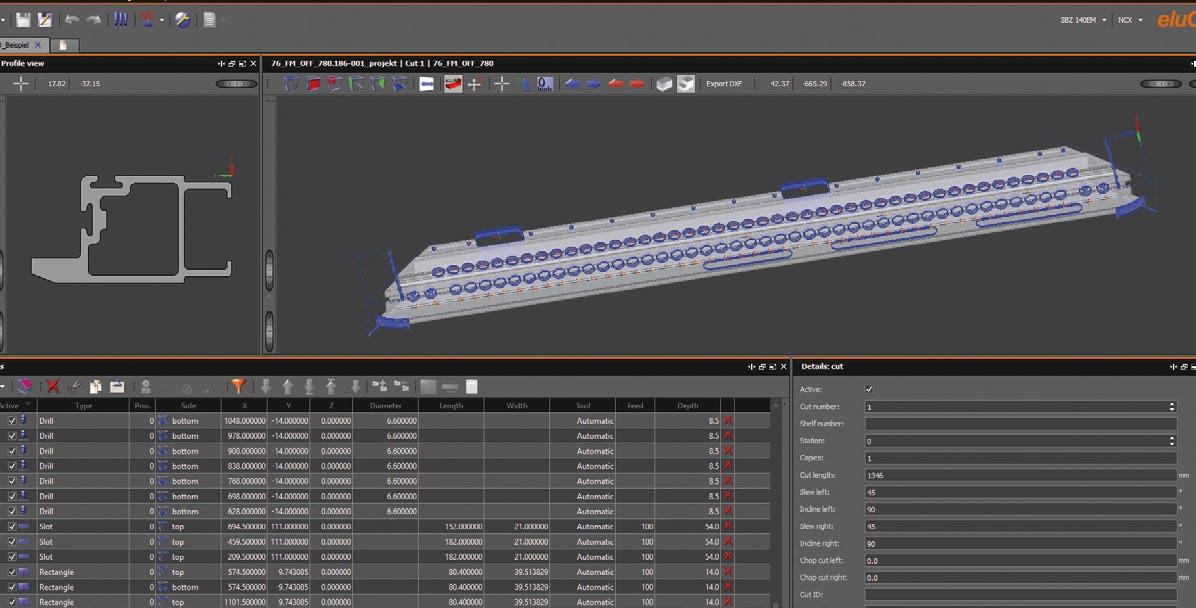 los clientes en continuo cambio exige a elusoft una continua disposición a la innovación y una gran capacidad de adaptación. El equipo cuenta con la disposición y la capacidad para ello. Entre los puntos más destacados del producto está el convertidor 3D que identifica y programa en cuestión de segundos las informaciones sobre longitud de perfil, sección de perfil y mecanizaciones contenidas en un modelo 3D. Esta conversión automática ahorra tener que introducir los datos a mano. Ello permite generar rápidamente programas de mecanización y transmitirlos a la máquina. El convertidor utiliza las informaciones de la base de datos y coloca los perfiles inmediatamente en la posición de sujeción correcta. Por ejemplo es posible importar como grupo completo elementos de fachadas que tengan varias piezas de perfiles.