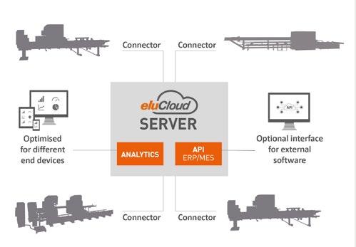 Una característica esencial de cualquier solución de "Industria 4.0" es la comunicación inmediata entre las máquinas individuales o entre la máquina y el software, lo que se resume frecuentemente con el concepto "Internet de las cosas". Esto se realiza con la ayuda de eluCloud-API. El concepto "API" designa a una interfaz con la que se integra la solución eluCloud en soluciones ya existentes y que puede conectarse con otras soluciones de software. Programas externos como, por ejemplo, programas de cálculos, sistemas ERP o MES pueden acceder a los datos de la máquina y a las evaluaciones recopilados en eluCloud para su utilización.