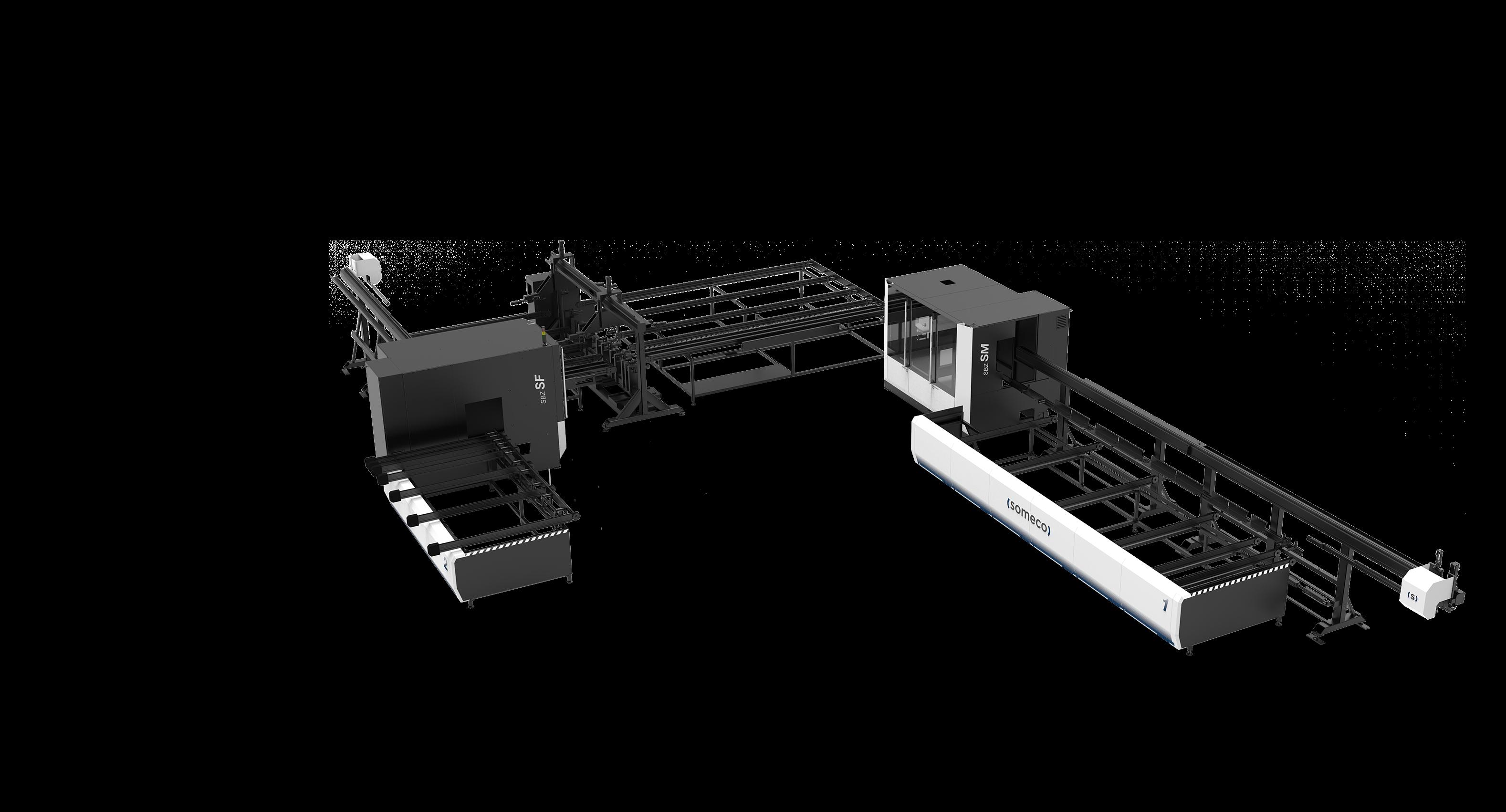 • Línea automatizada de corte y mecanizado CNC de barras de paso continuo, diseñada para corte, fresado, taladrado, contorneado, atornillado y fijación a pared