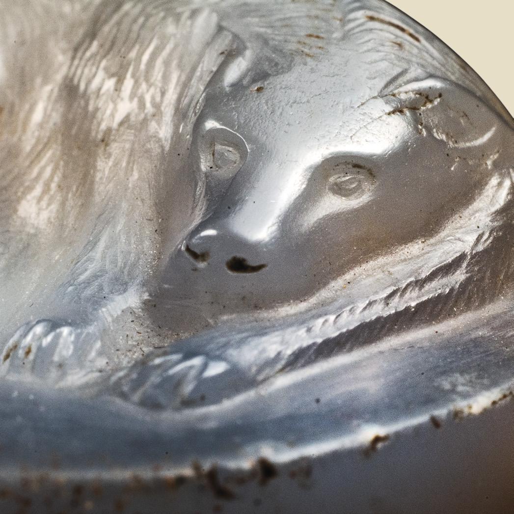 The cameo of banded agate has an attractive semi-translucent, shining gray background. The animal’s body, its soft skin skillfully modeled from the opaque white layer of the cameo, contains occasional light-brown inclusions that imitate the naturally occurring color patches of the dog’s skin.