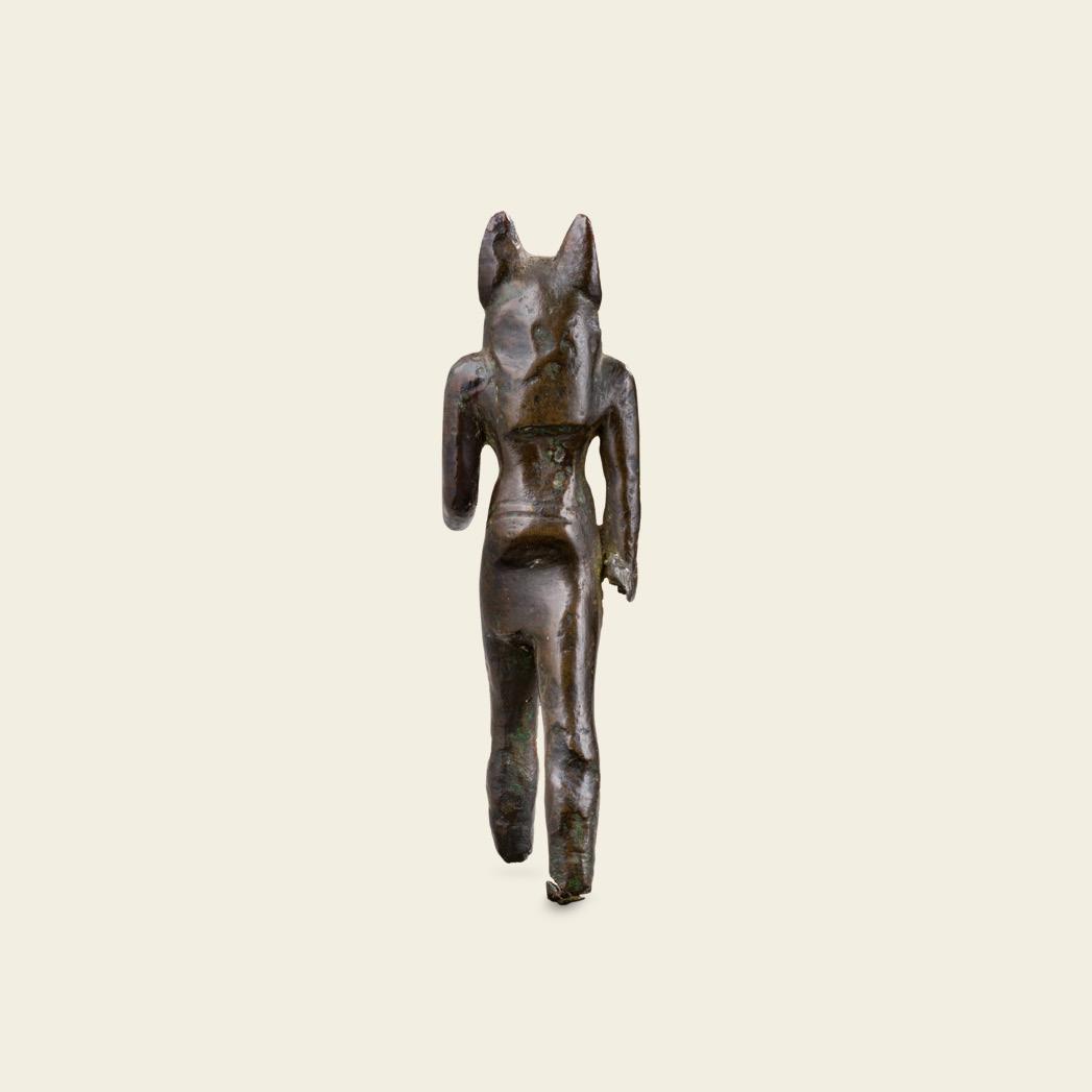 This head represents Anubis, the canine god, who was considered the most important Egyptian funerary deity before the rise of the cult of Osiris. Leader of the dead and lord of the sacred land (desert areas where the cemeteries were situated), he was specifically called a master of the place where embalming was carried out. In myth, it was Anubis who embalmed the body of Osiris and the deceased king.