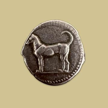 The same subject of a sleeping dog appears on ceramic Greek vases (see cat. no. 20) and Roman lamps. A very curious example is provided by an Italic bronze coin minted in Hatria (Picenum), a Latin colony in central Italy, in the first quarter of the 3rd century B.C.; the reverse of this unusually large and heavy cast coin represents in relief a dog lying asleep. It has been said that the dog, famous for loyalty to is owner, symbolizes the loyalty that the city showed to Rome.