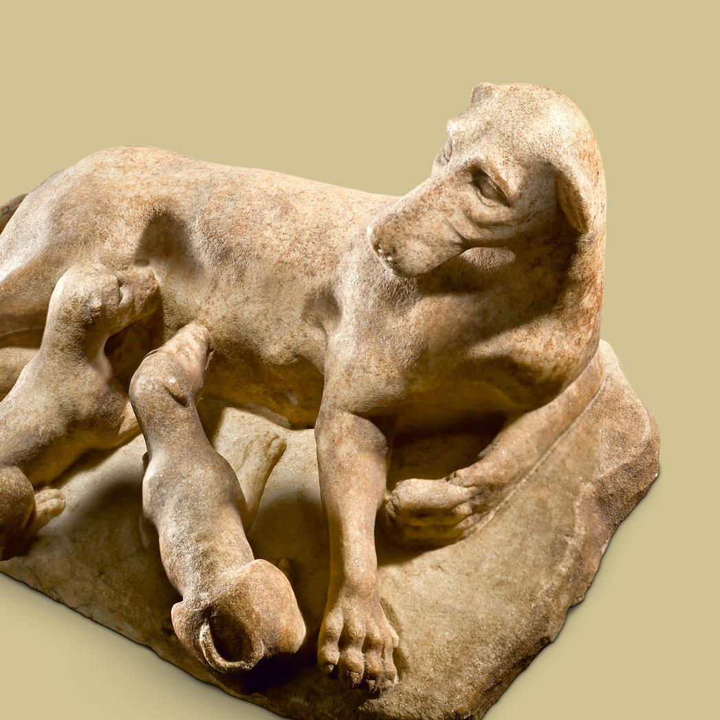 Indeed, keeping the basic composition of the animal lying down, the dog could be represented as awake, raising the head, the ears pricked up and alert as if something or someone had just disturbed his sleep (cat. no. 6). Acknowledging the presence of his master, Argos does not betray his master with a bark and assumes the appropriate attitude: