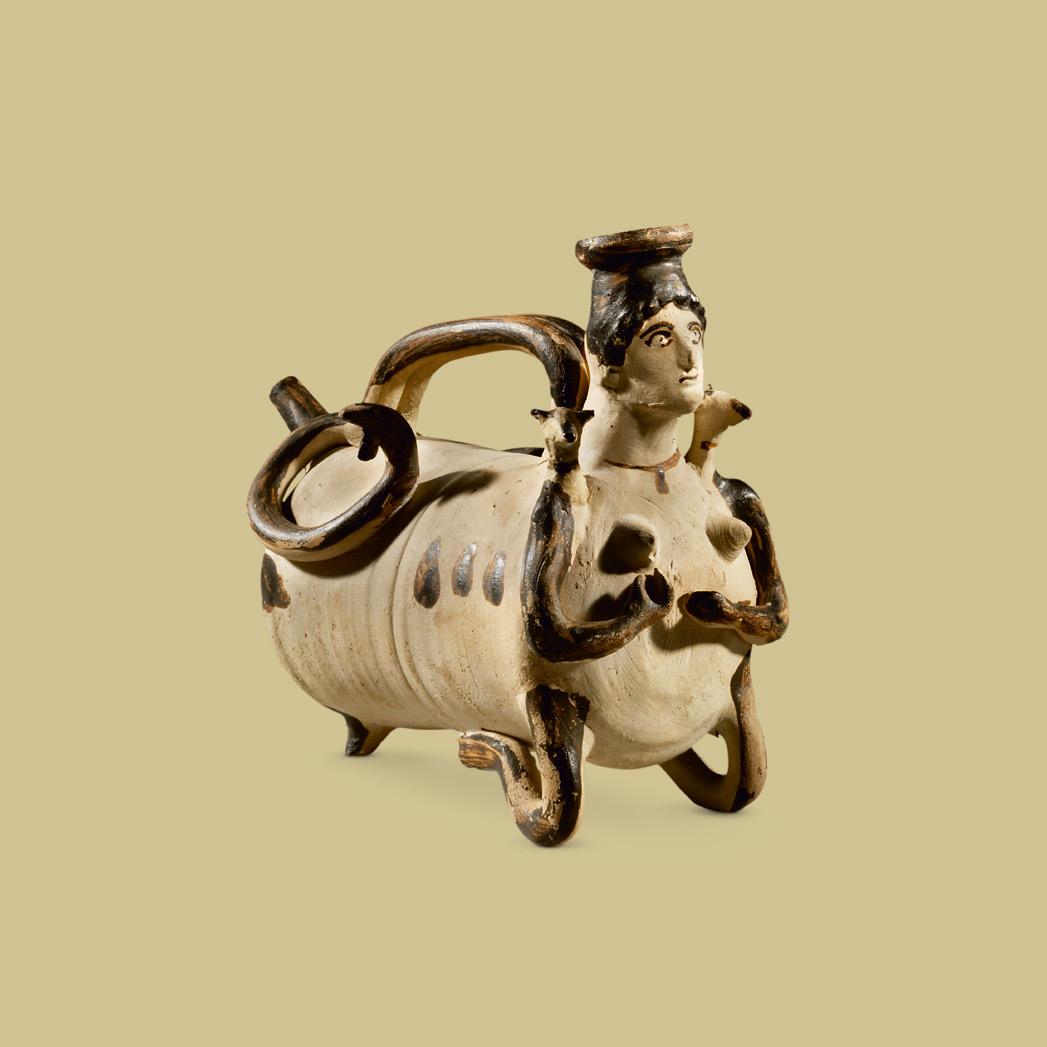 With a frightening visage, the mythical female monster Skylla adorns the front of this unusually shaped askos. Transformed by a Sicilian artist into a highly animated ceramic decoration, she wears a necklace and an amulet. Her neatly coiffed, curly hair frames her forehead, above which is the circular mouth of the askos. With her sphinx-like, empty expression, emphasized by staring eyes and thin lips, Skylla’s appearance does little to convince us of her humanity or good intentions. A double ribbed handle extends from the back of Skylla’s neck to the exterior part of the vessel where it takes on a new function as the two ribs loop around on either side of the vessel and terminate in open-mouthed, writhing snakes. Two dogs’ heads sprout up from Skylla’s shoulders, from which arms with hands resembling snakes’ heads arch around prominently featured breasts; she kneels on tubular-shaped forelegs. Dark brown glaze accentuates face and hair, arms, feet, handle, snakes, the dogs’ heads, spout, and rim of the mouth. Highly unusual and almost unique in its representation of Skylla, this askos type (with suspension lugs or handles, the wide mouth for ease of filling and the narrow spout for pouring) was intended for cult purposes and the pouring of libations.
