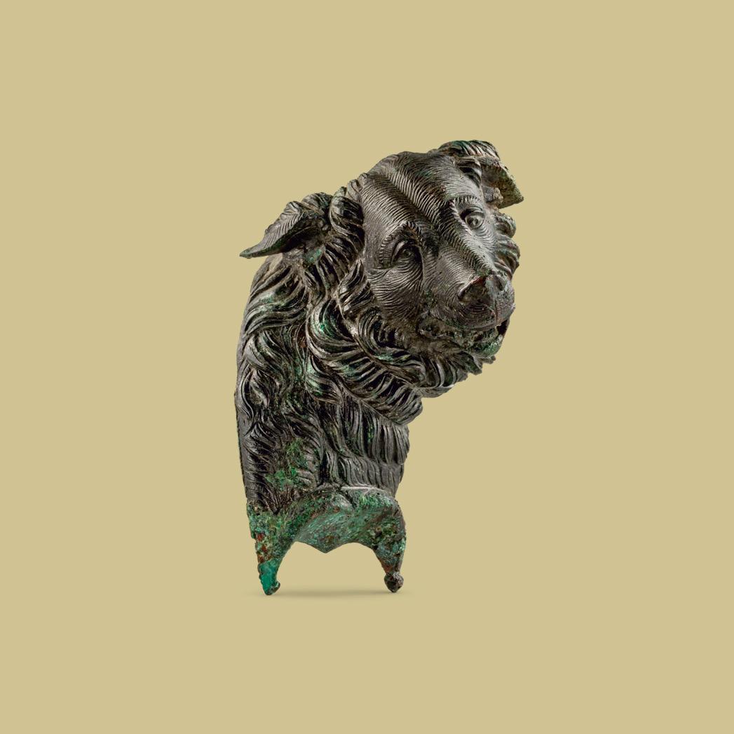 This fulcrum of exceptional artistic quality was hollow cast in the form of a dog protome (the head and neck or upper torso of an animal or a person). The neck is long and curved, adorned with a shaggy coat of curly ringlets. The face is sensitive, its eyes wide and downcast, its ears downturned and topped with the same thick curly fur that covers the neck. The face is adorned with shorter fur, delicately rendered. The mouth is opened slightly, revealing the hound’s canine teeth. The skillful modeling of the face and neck illustrate the Graeco-Roman taste for naturalistic detail.
