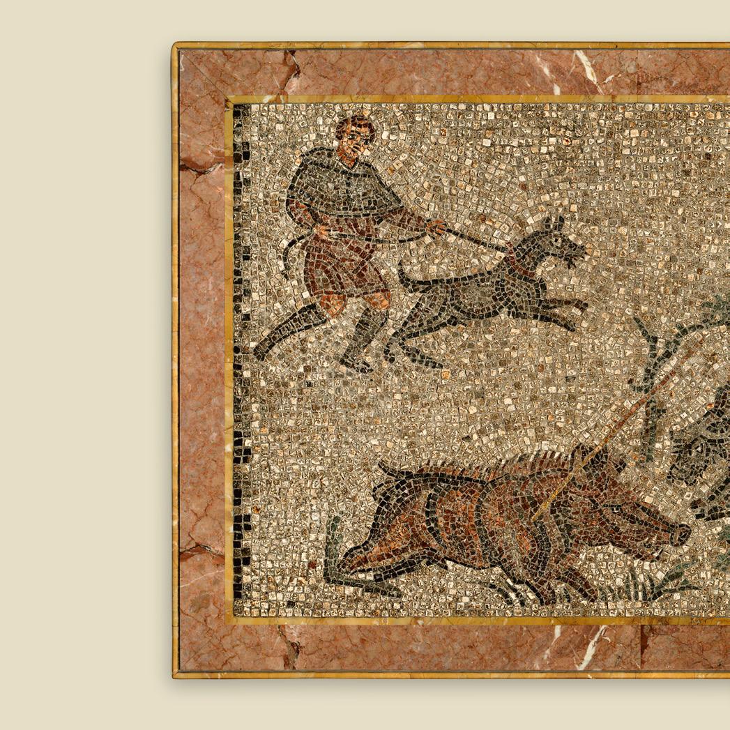 It is also possible that the scene represents the mythological Hunt of the Calydonian Boar. This famous tale concerns the giant boar that the angry goddess Artemis sent to ravage the region of Calydon in Aetolia; the creature was killed by the hero Meleager. In the representation, two dogs—looking small compared to the beast—bravely attack the kneeling, already wounded boar, while the hunter on horseback raises one arm to slay it with his spear.