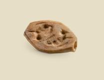 This disc-shaped piece perforated on both its horizontal and vertical axes is a phalera, a decorative element with cross-like perforations to receive the suspension straps. It could have served as an amulet worn by a civilian or as a military ornament, a mark of honor (sets of phalerae could adorn a soldier’s cuirass); it could also have been worn with horse trappings. Gorgoneia and heads of Erotes are the most common subjects employed for phalerae; a sleeping dog is a very rare one. Modeled in high relief, the hound rests with his head between his outstretched forepaws. The curving line of his spine and long tail follows the curved edge of the stone. Several parallel and wavy incision lines mark the details of the fur on both sides of the spine.