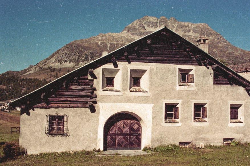 87 Chesa Merleda (1642-49, 1999 von Hans Jörg Ruch renoviert, siehe nächste Seite) ins Auge. Sie ist ein nationales Baudenkmal aus einer Zeit, als Zinnen gerade en vogue waren, und beeindruckt mit den riesigen Proportionen, der schönen Verbindung von Scheune und Wohnen, sowie den fröhlichen Kamintürmchen. Etwas flussaufwärts steht das geschichtsträchtige