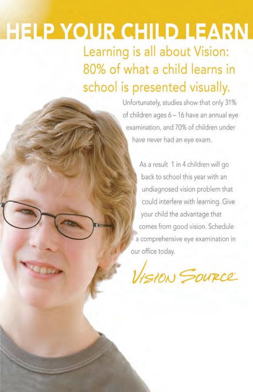 and 70% of children under 6 have never had an eye exam. As a result 1 in 4 children will go back to school this year with an undiagnosed vision problem that could interfere with learning. Give your child the advantage that comes from good vision. Schedule a comprehensive eye examination in our office today.