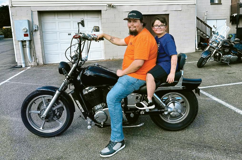 wheeler, and riding on his brother Caleb’s motorcycle. “Kiba is far exceeding our expectations,” said Ashley. “They told us, don’t expect him to live more than a year. Every day is like a blessing because he is still here with us. He has like improved a lot since he was little. He does have his setbacks like everybody has their own setbacks. But he just, he pushes on, and he even gives people adults courage, so he’s a trooper, for sure.”