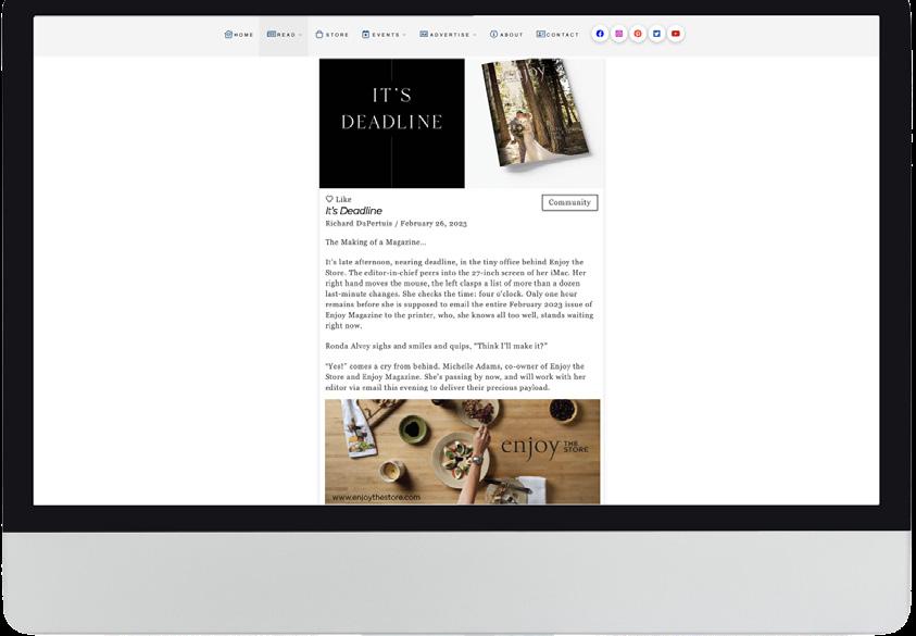 ©2023 by Enjoy Magazine. All rights reserved. Reproductions without permission are strictly prohibited. Articles and advertisements in Enjoy Magazine do not necessarily reflect the opinions of the management, employees, or freelance writers. Every effort is made to avoid errors, misspellings and omissions. If an error is found, please accept our sincere apologies and notify us of the mistake. The businesses, locations and people mentioned in our articles are solely determined by the editorial staff and are not influenced by advertising.