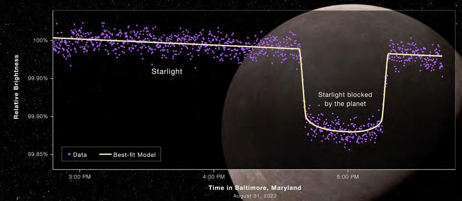 A light curve from NASA’s James Webb Space Telescope’s Near-Infrared Spectrograph shows the change in brightness from the LHS 475-star system as a planet transited the star on 31 August 2022. This observation was made using NIRSpec’s bright object time-series mode, which uses a grating to spread out light from a single bright object, like the star LHS 475. It measures the brightness of each wavelength of light at set intervals of time.