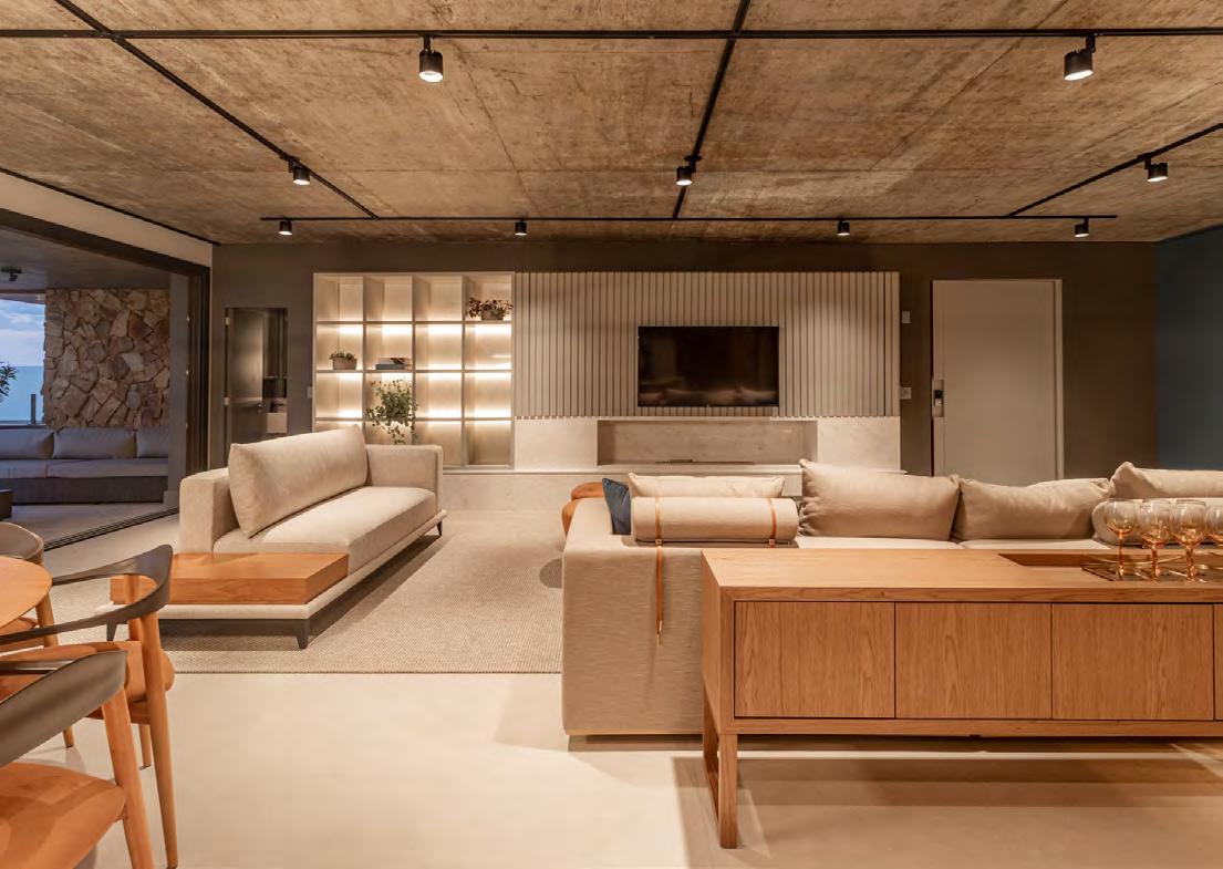 sta sala de estar oferece uma atmosfera de requinte e elegância que se manifesta em cada detalhe. As tonalidades de madeira e cinza se combinam de forma harmônica e produzem uma sensação de serenidade, enquanto o teto em concreto aparente adiciona um toque industrial moderno. O ripado em Laca fosca do painel da TV traz um diferencial, sobressaindo juntamente como o Mármore Piguês que reveste a lareira. Além disso, esses materiais estabelecem um leve contraste com o painel de Melamina Louro Pardo que cobre a entrada da lavanderia.