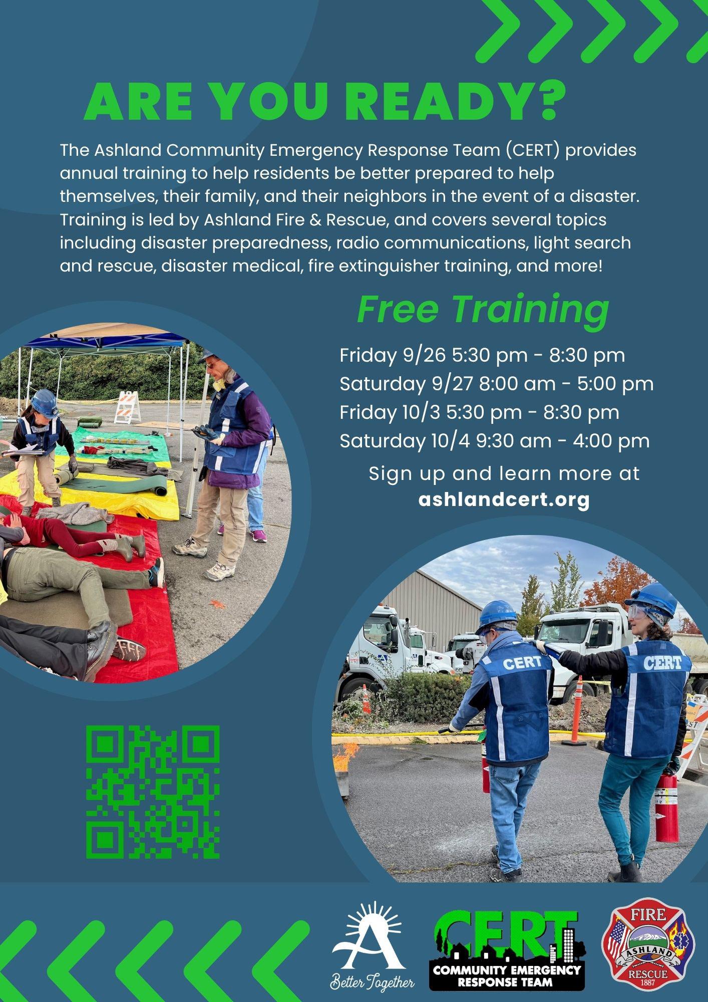 To learn more about Community Emergency Response Team (CERT), goto: ashlandoregon.gov/212/CERT-YourCommunity-Emergency-Response-T