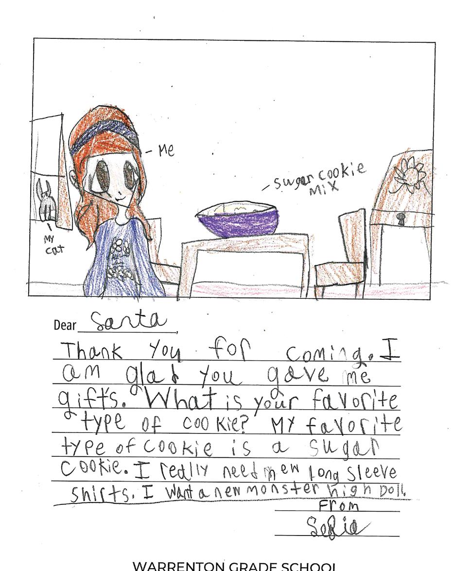 Thank you for coming. I am glad you gave me gifts. What is your favorite type of cookie? My favorite type of cookie is a sugar cookie. I really need new long sleeve shirts. I want a new monster high doll. From, Sofie