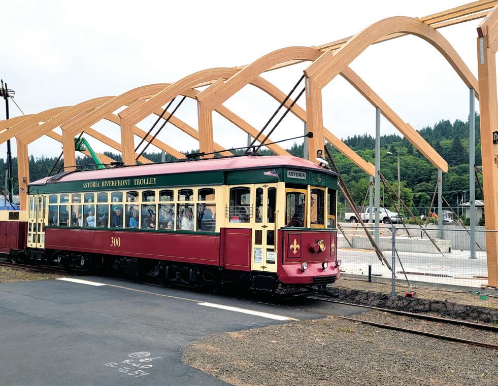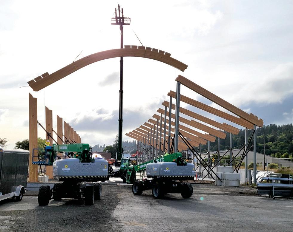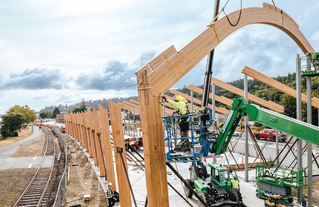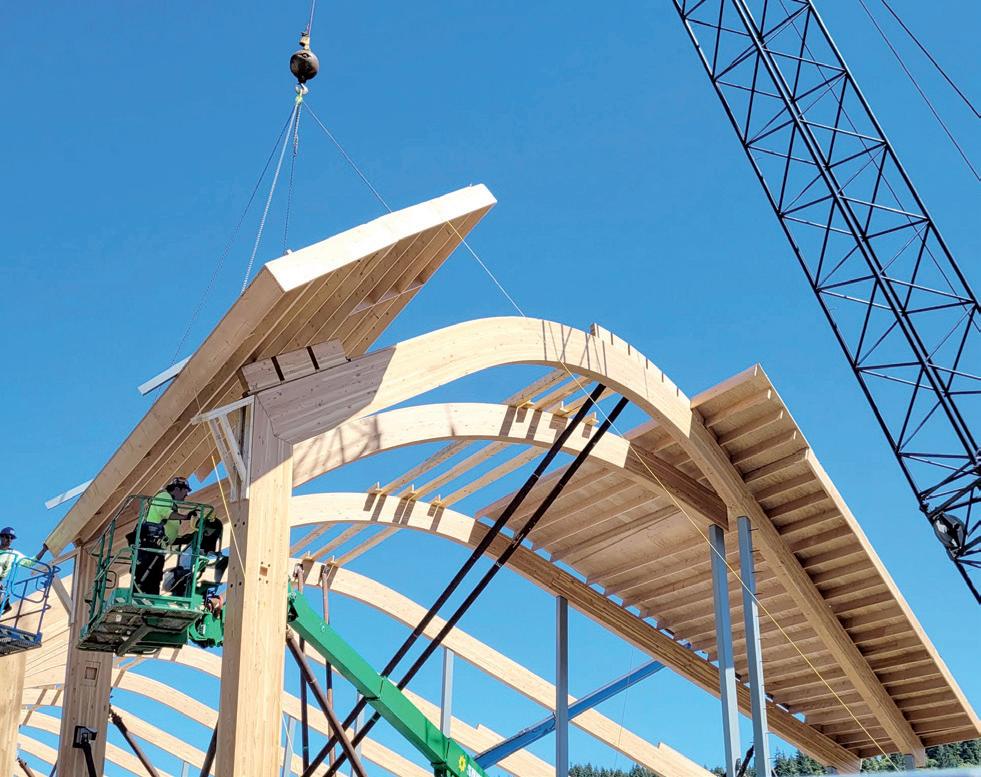 Worker guides the final arched beam into position, on June 27, 2025, as part of the Mariners Hall Topping Off Ceremony at Columbia River Maritime Museum.
